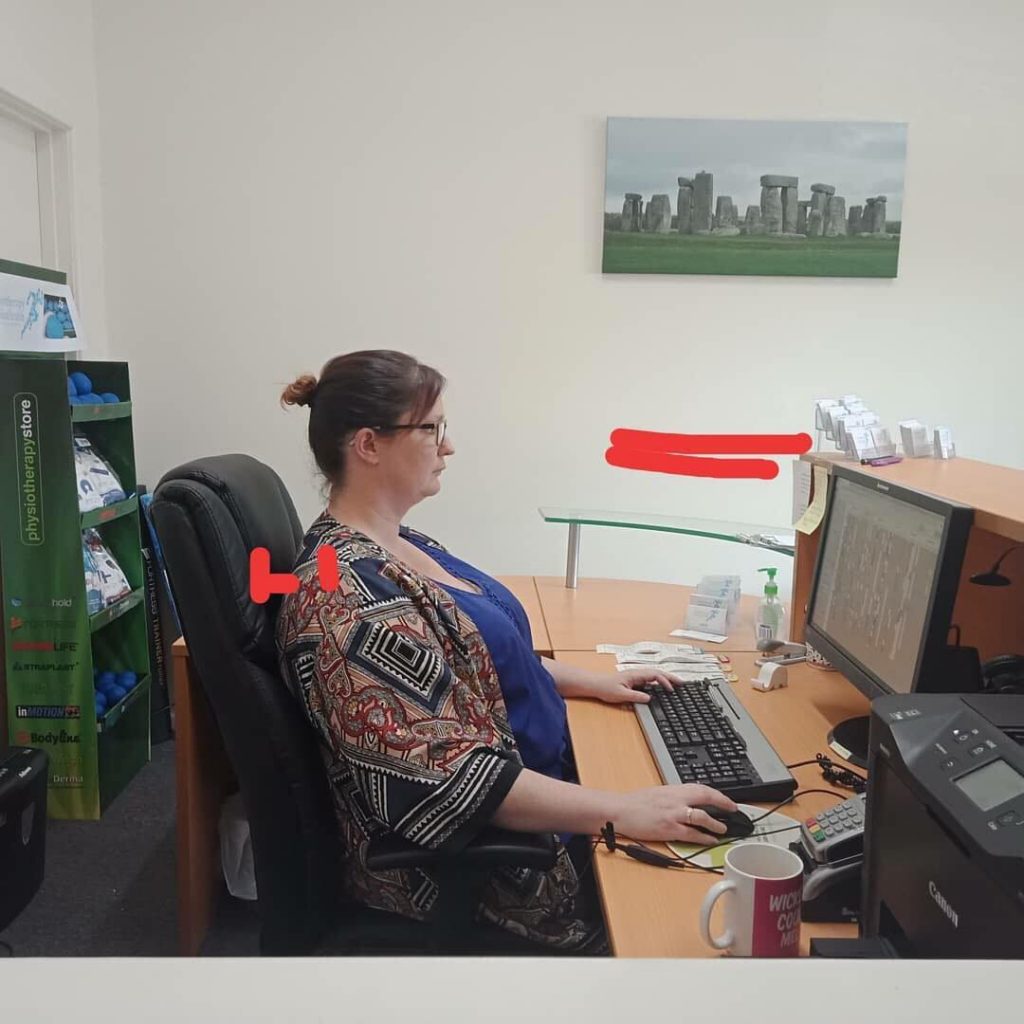 In the pre assessment photo below, our receptionist Mel sits forward on her chair which removes the support of her backrest. She also has her monitor positioned very low, causing her to look down to view the screen. Unsurprisingly, she frequently suffers with neck pain and occasionally gets a headache.